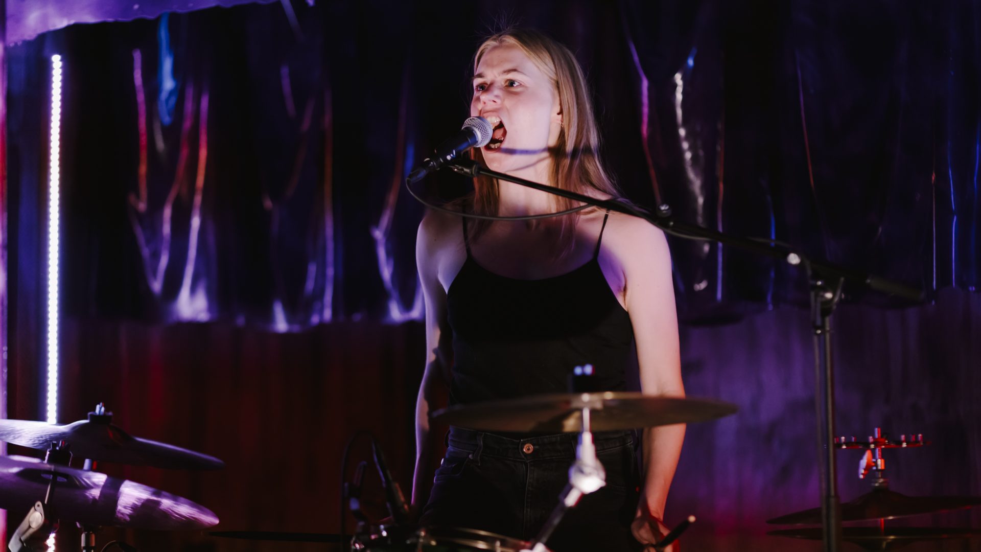 Stina Force is een one-woman punkband die je live moet meemaken. Elke show is uniek: geïmproviseerde zang, groteske monologen en rauwe drums ontstaan ter plekke. De energie beweegt voortdurend tussen Stina Force en publiek. Alles gebeurt in het moment, met een energie die van het podium het publiek in knalt.